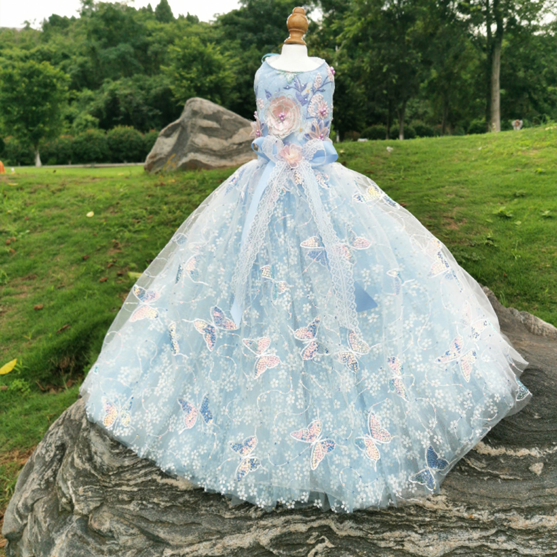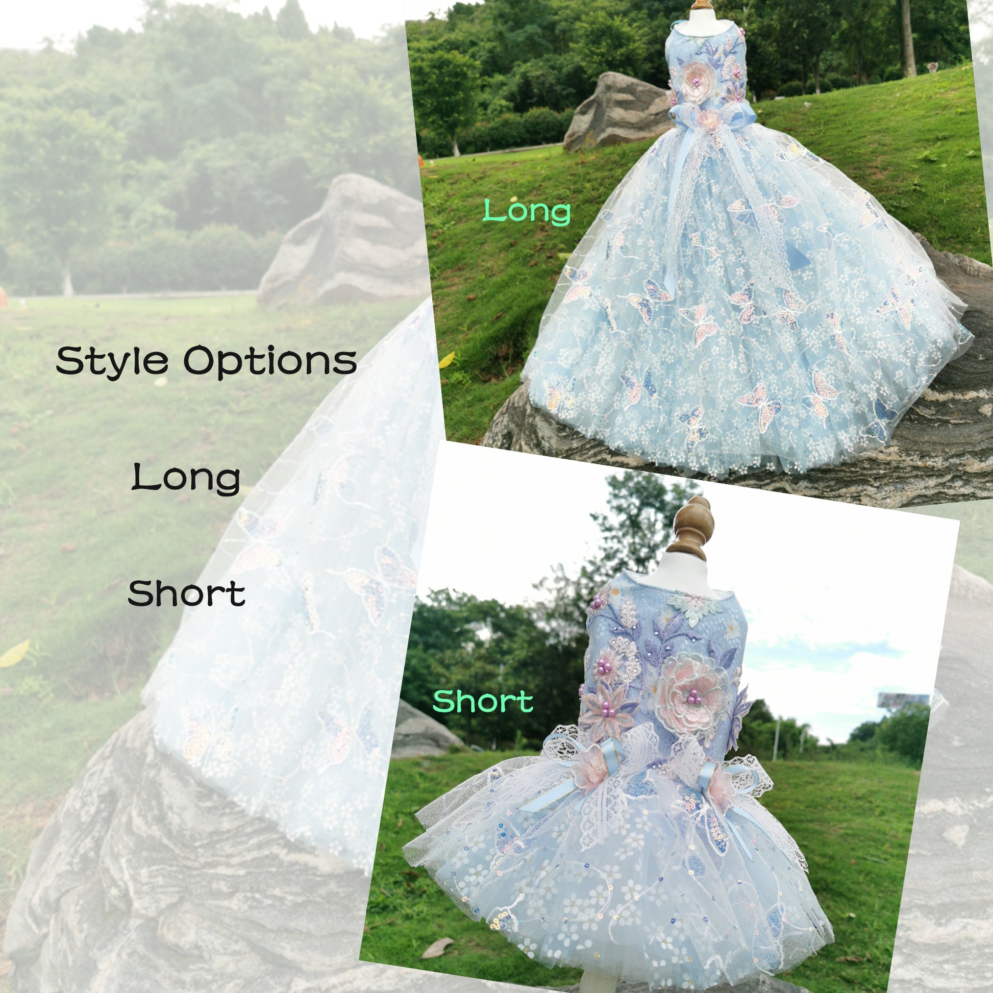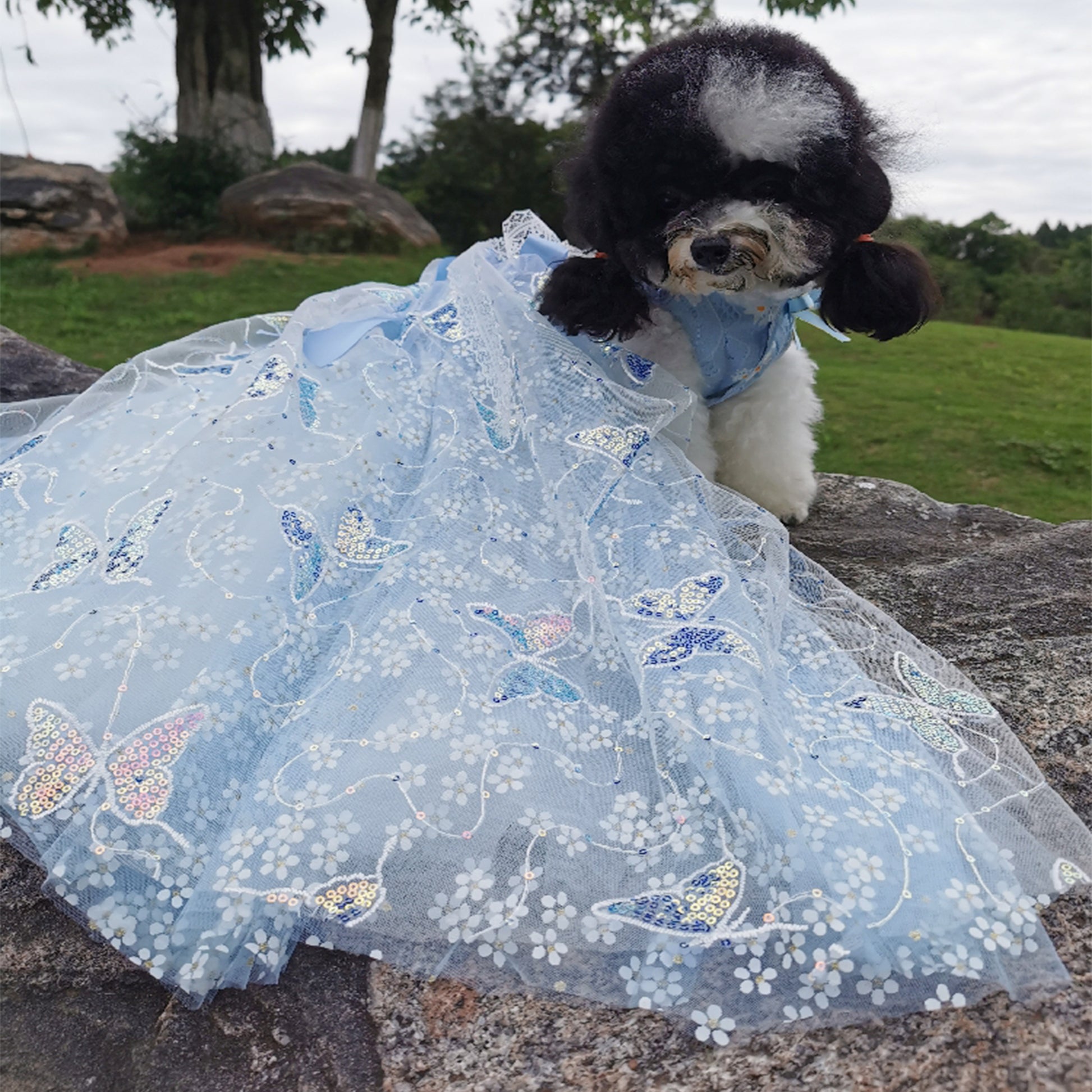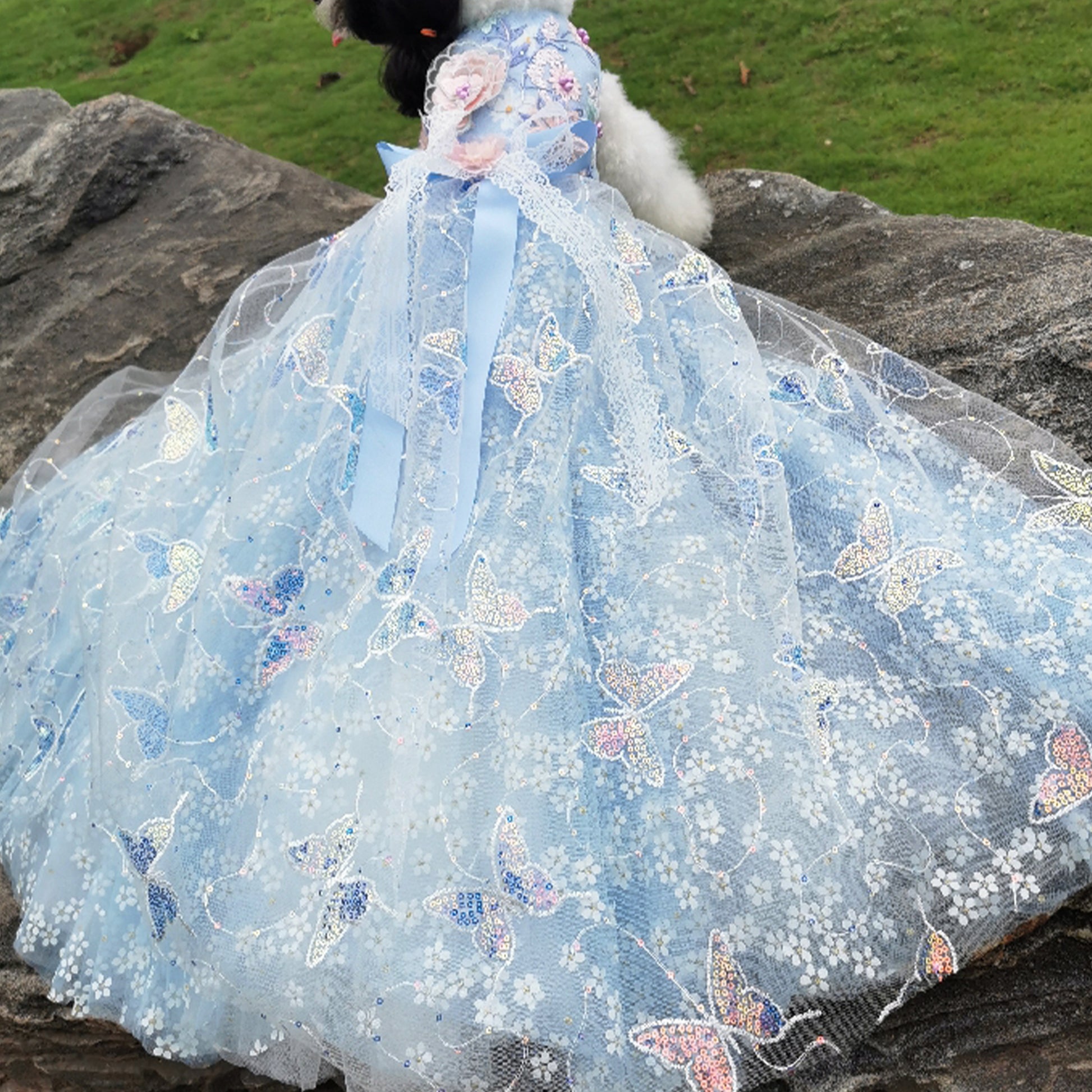 🎀The intricately made pet long train wedding dress is a work of art. Lightweight chiffon, breathable and flowing, hosts ingenious embroidery of butterfly and floral in glimmering gold and silver threads.