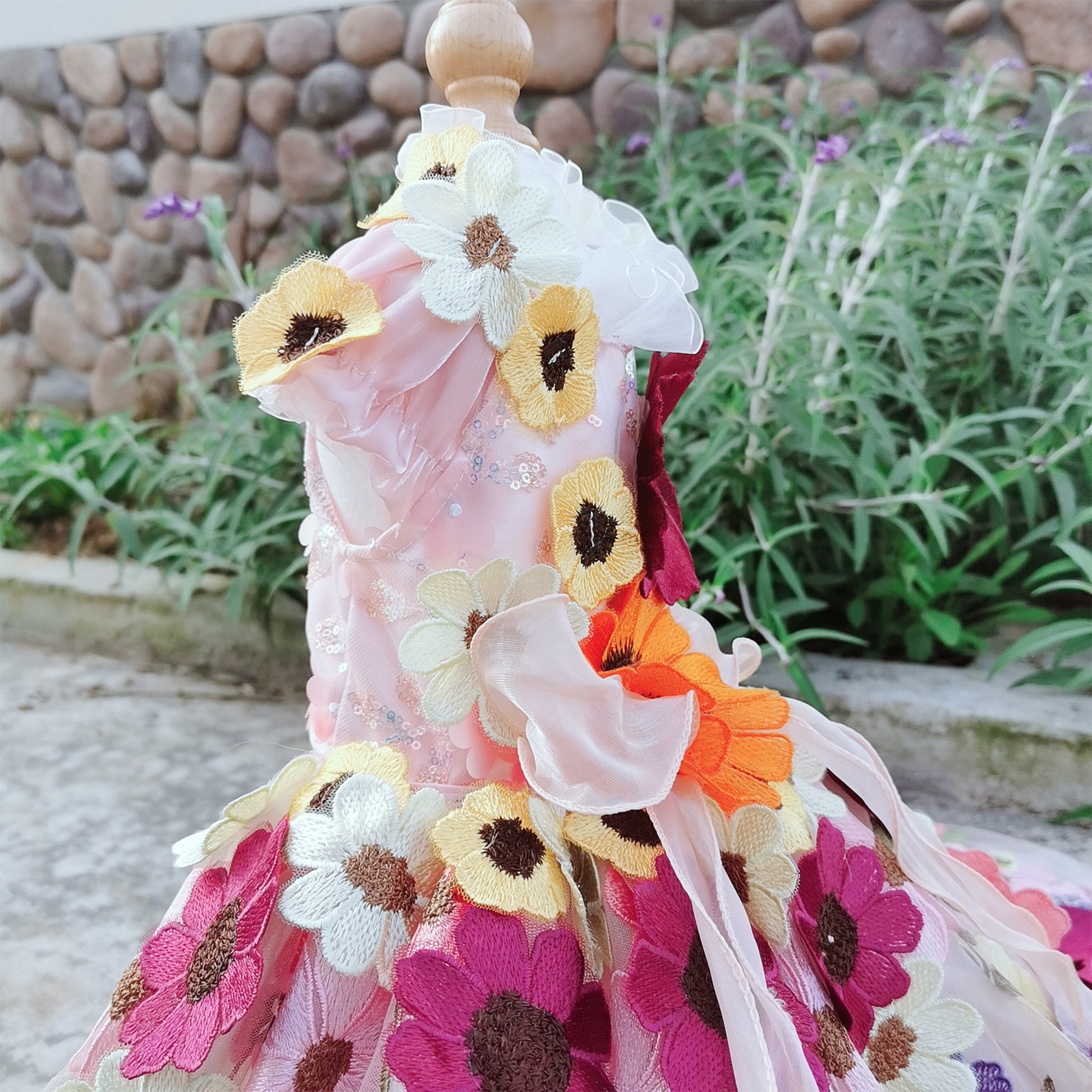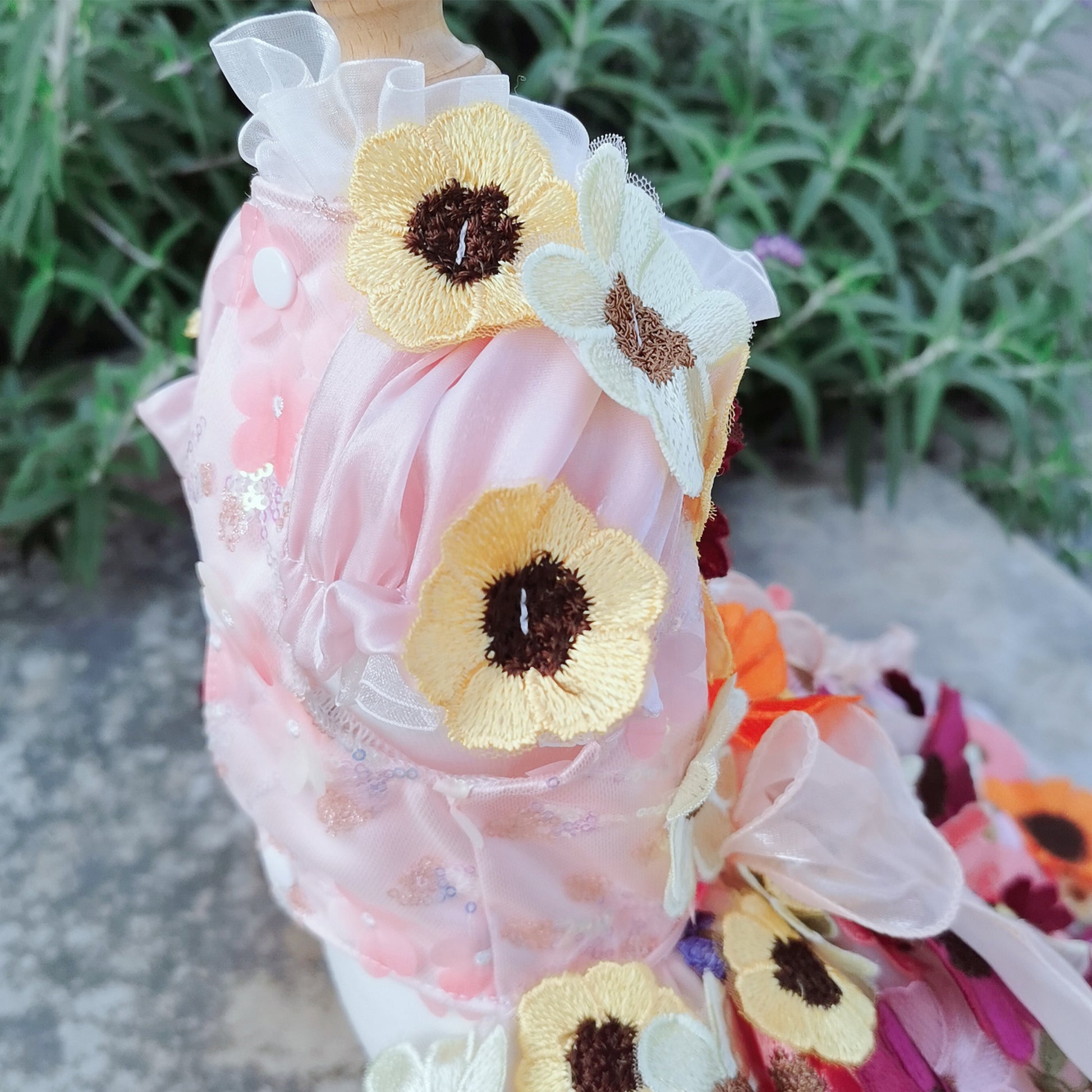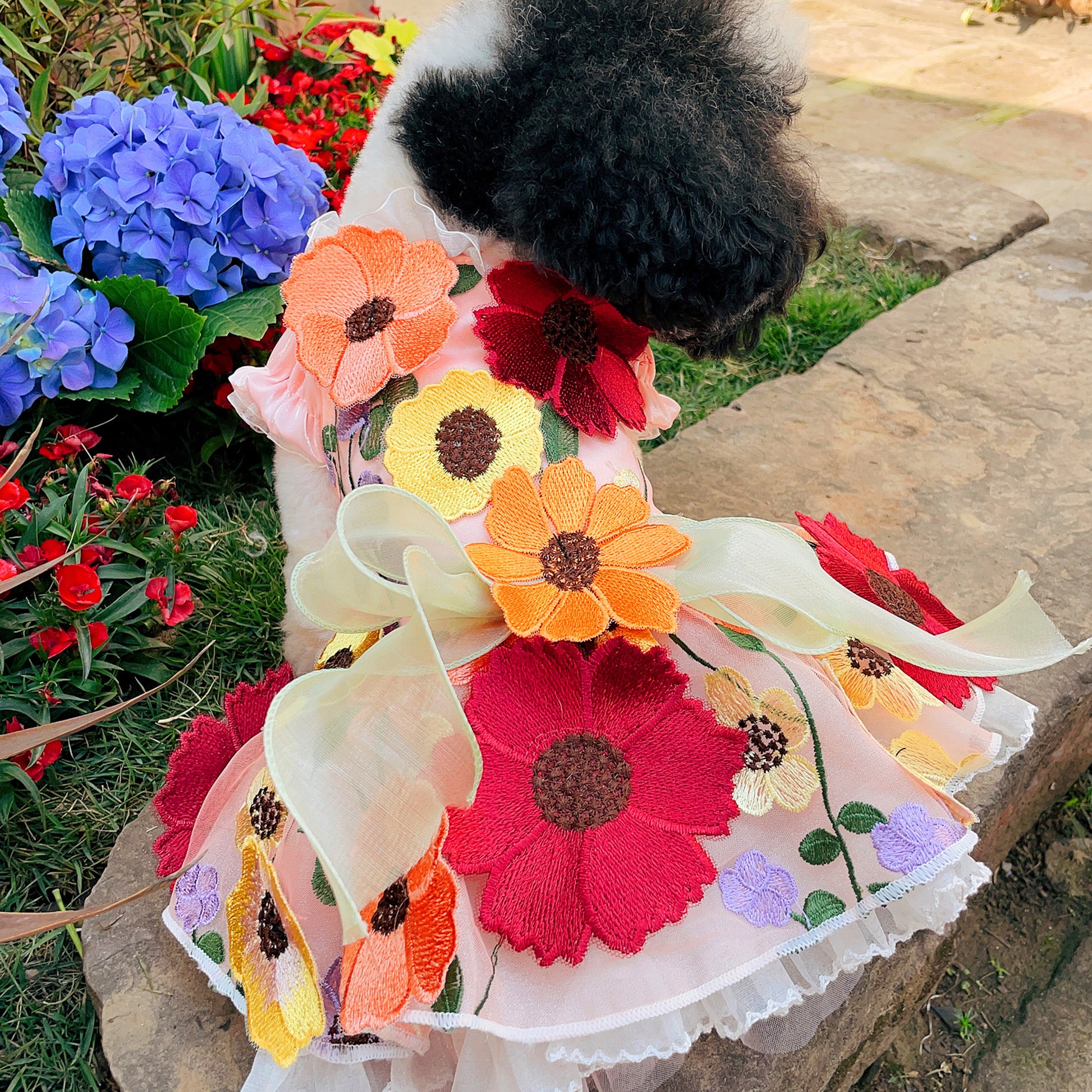 Handmade Dog Dress with 3D Embroidered Sunflower Tulle - Long - Tail Gown