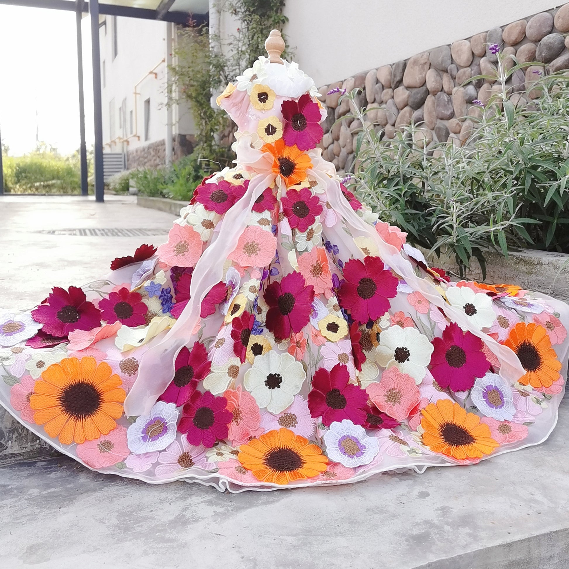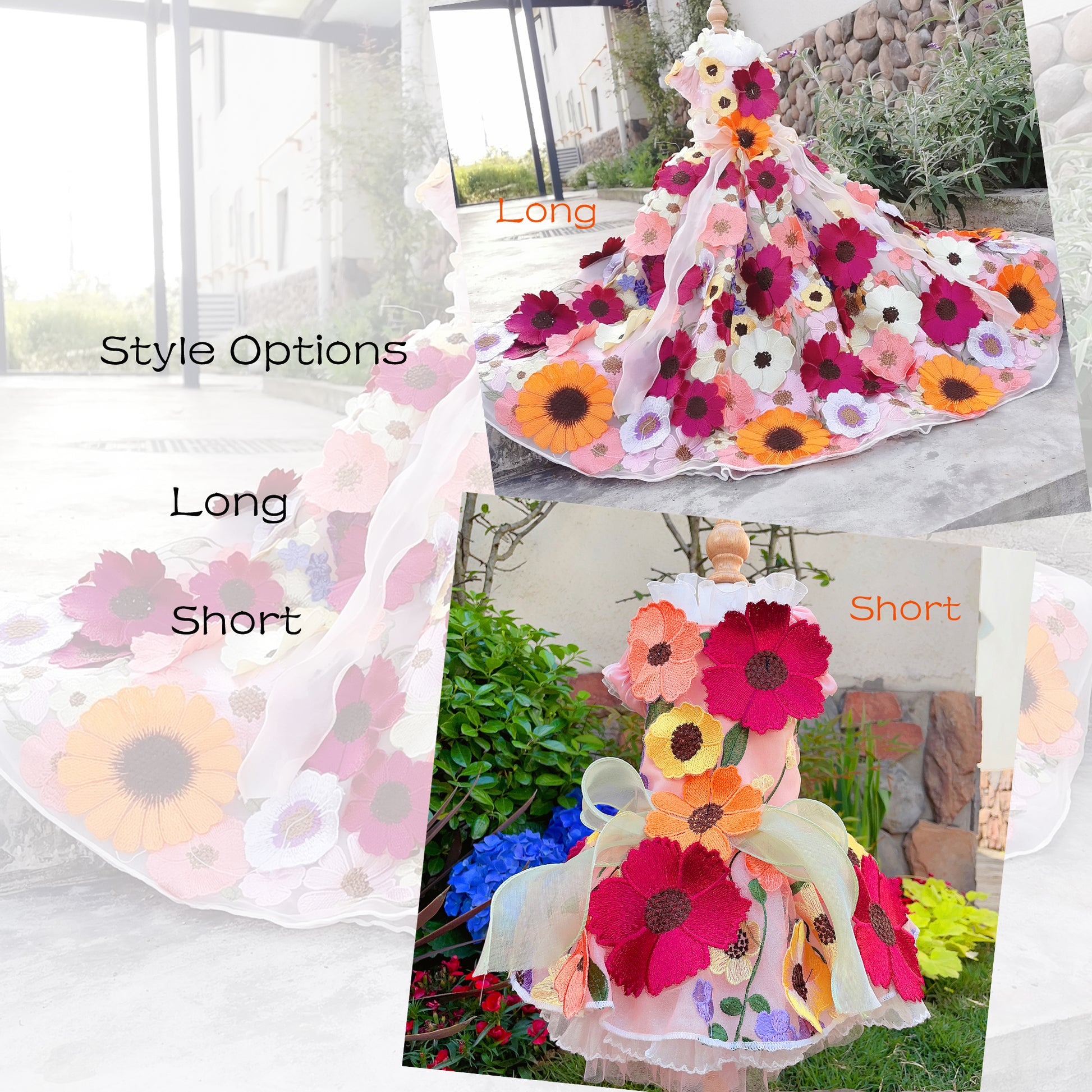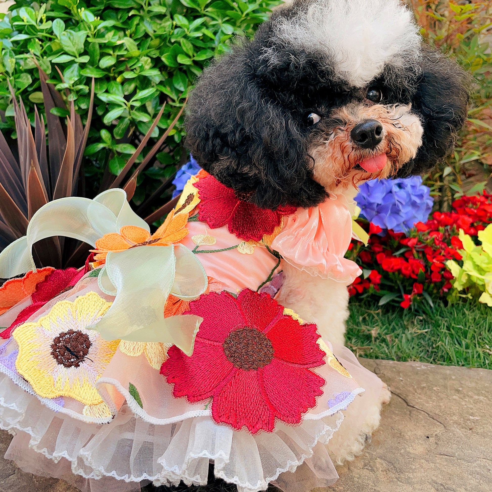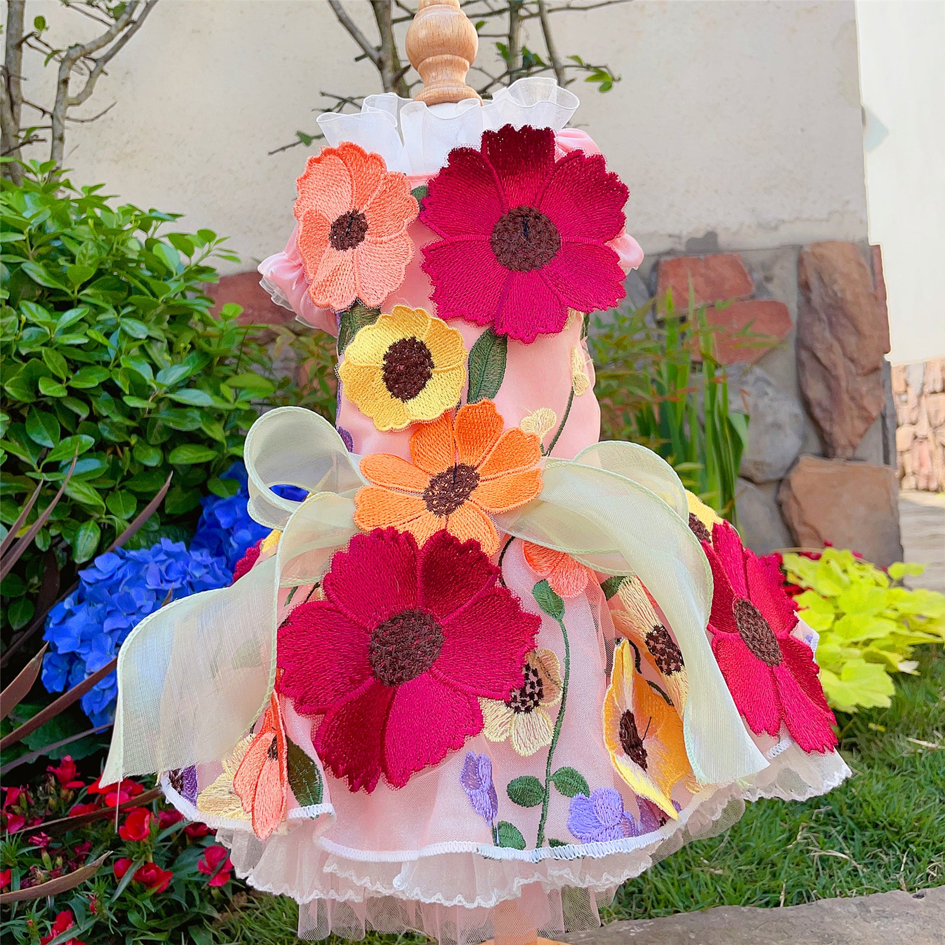Handmade Dog Dress with 3D Embroidered Sunflower Tulle - Long - Tail Gown